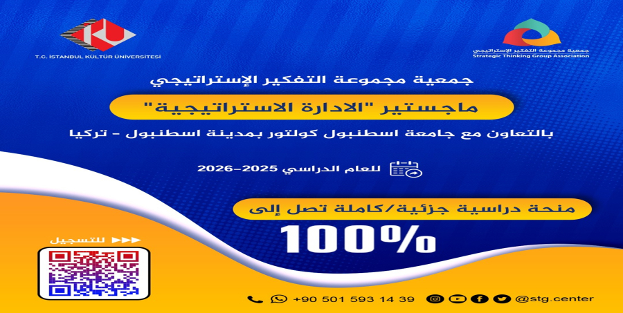 تعلن جمعية مجموعة التفكير الاستراتيجي عن فتح باب الترشح للحصول على المنحة الدراسية ( كاملة / جزئية ) لدراسة ماجستير/ الإدارة الاسترتيجية باللغة الانكليزية أو اللغة التركية للعام الدراسي -2026 2025 وذلك بالتعاون مع جامعة اسطنبول كولتور بمدينة اسطنبول/ تركيا