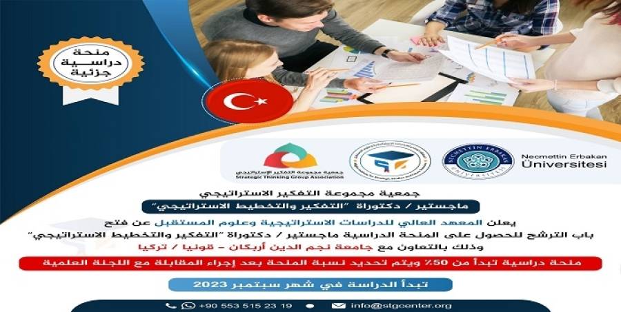 يعلن المعهد العالي للدراسات الاستراتيجية وعلوم المستقبل عن فتح باب الترشح للحصول على المنحة الدراسية ( كاملة / جزئية ) ماجستير/دكتوراه "التفكير والتخطيط الاستراتيجي" باللغة الانكليزية للعام الدراسي 2023-2024 وذلك بالتعاون مع جامعة نجم الدين أربكان – قونيا / تركيا